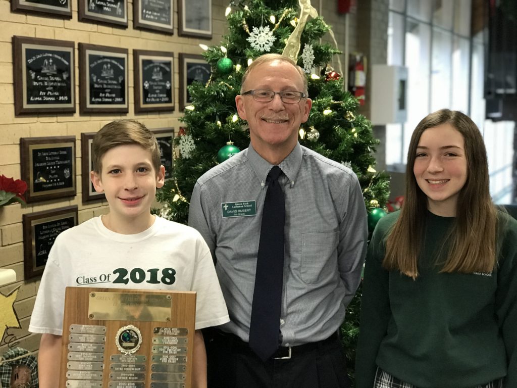 He’s pictured with middle school Social Studies teacher, Mr. Dave Rusert and runner-up 8th grader, Addie C.