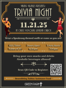 PTO is hosting their annual Trivia Night to benefit the Tuition Assistance Fund! Join us on Friday November 21, 2025 at Christ Memorial Lutheran Church. Doors open at 6:30p. Trivia starts at 7:00p.  Register by scanning the QR Code or follow the link.